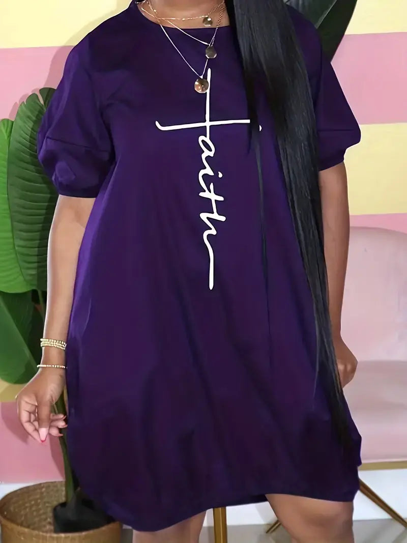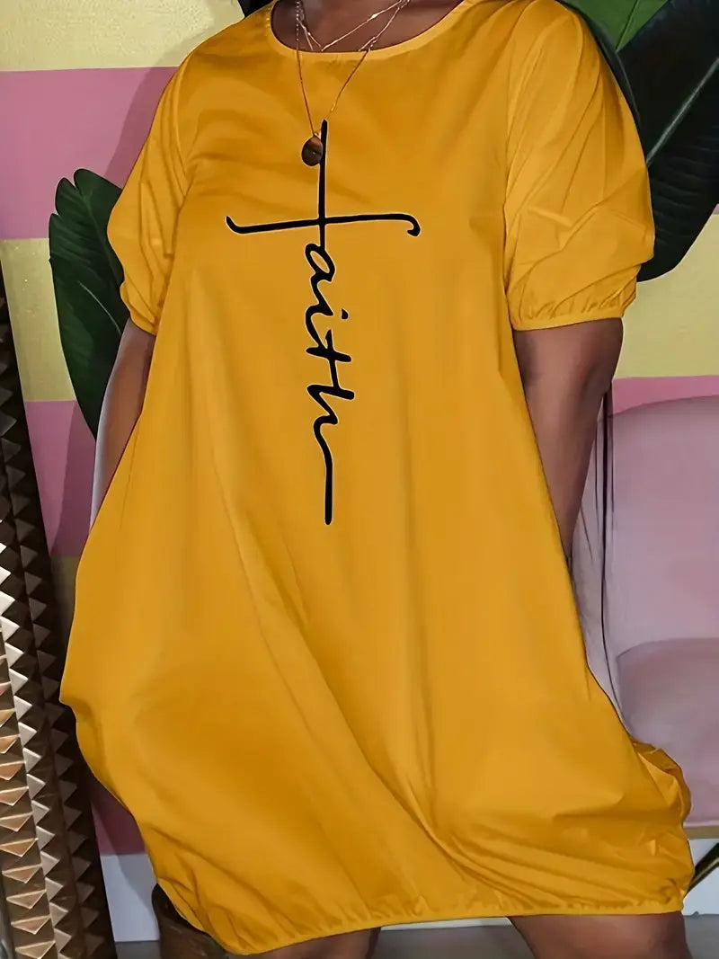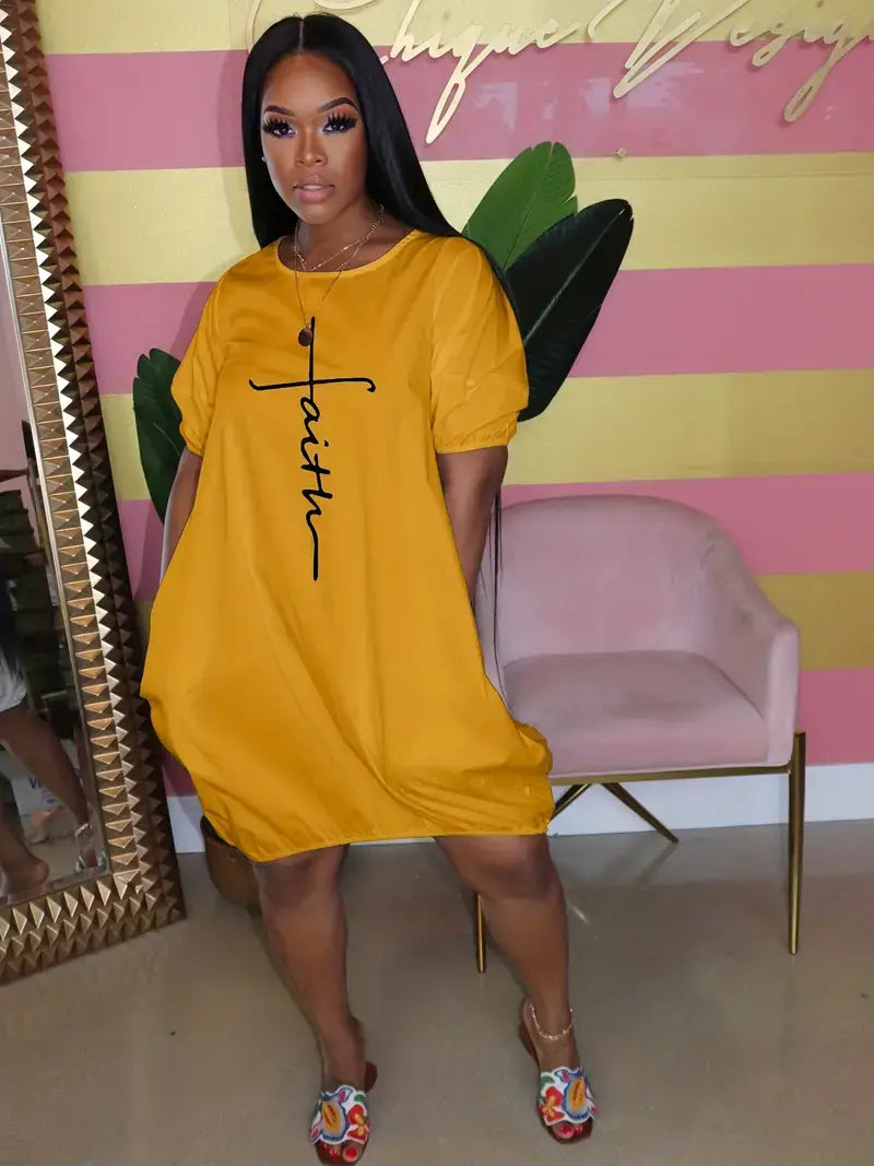 Plus Size Casual Dress,Women's Plus Letter Print Puff Sleeve