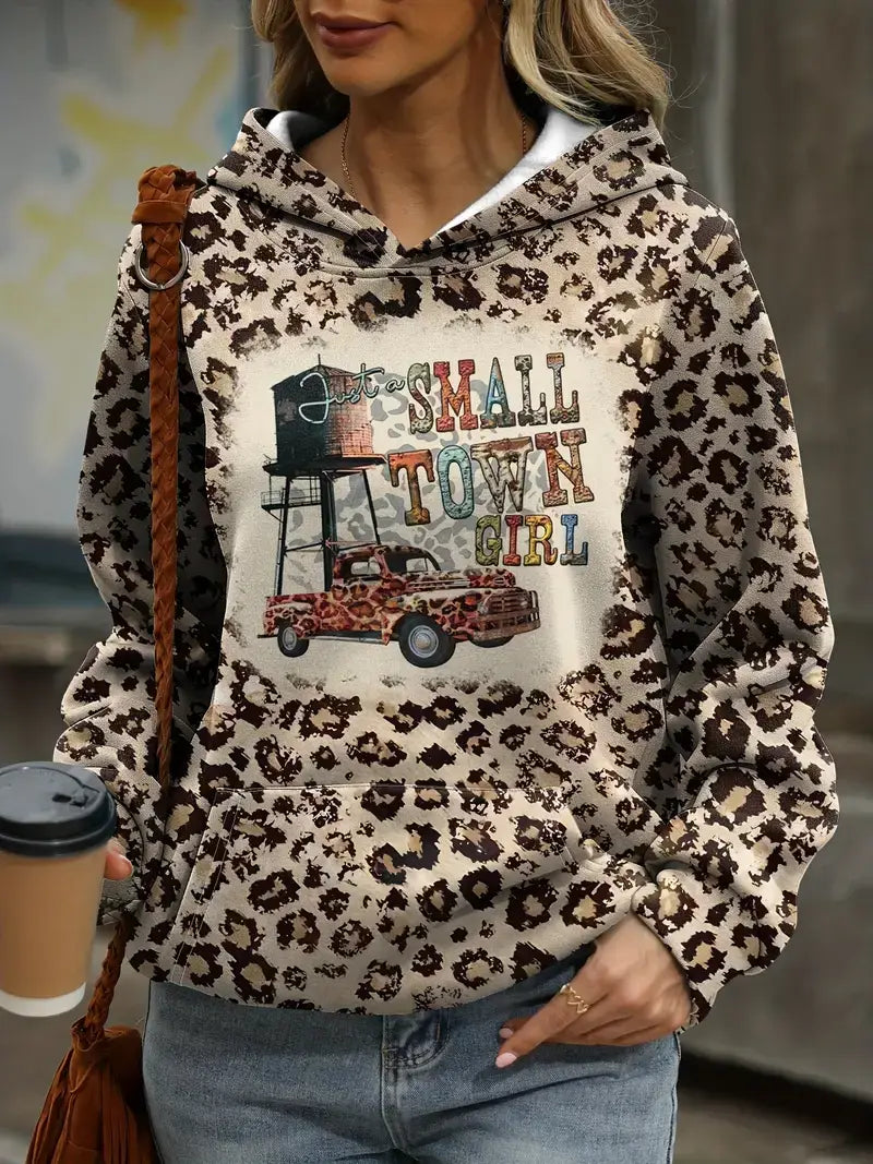 Plus Size Casual Hoodie, Women's Plus Leopard & Letter Print